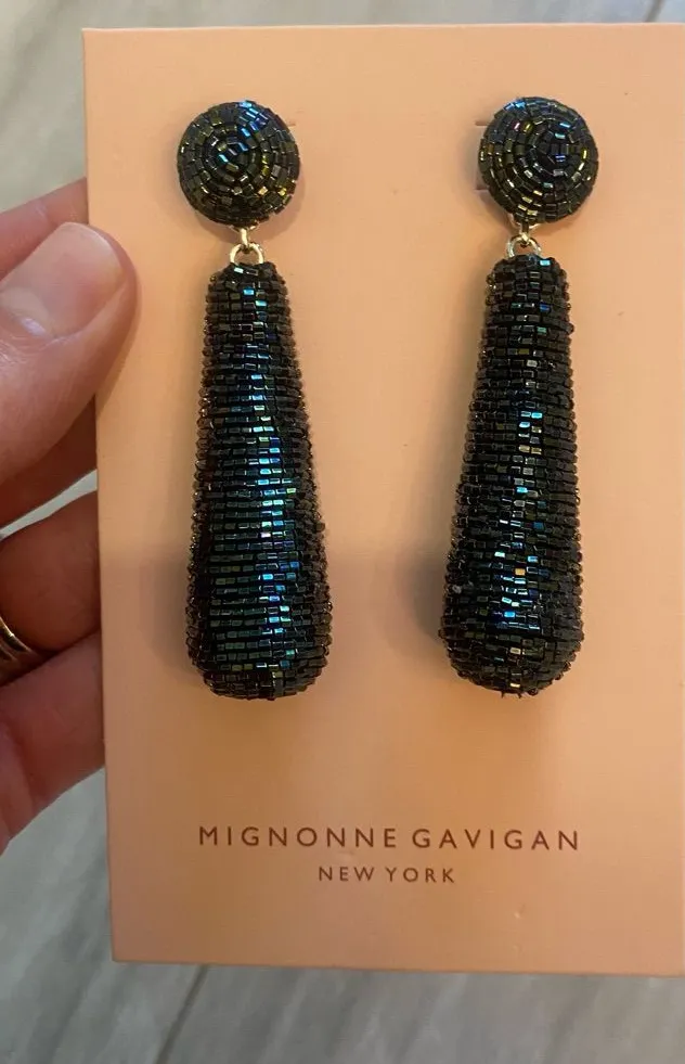 Mignonne Gavigan drop earrings, one size, oil slick color, dark blues and black beaded, for Pierced ears, approximate measurements shown, new and in original packaging Shimmer, sparkle, neutral, formal, glam, statement, designer, dark, night out, classic, elegant, black tie, wedding, beads