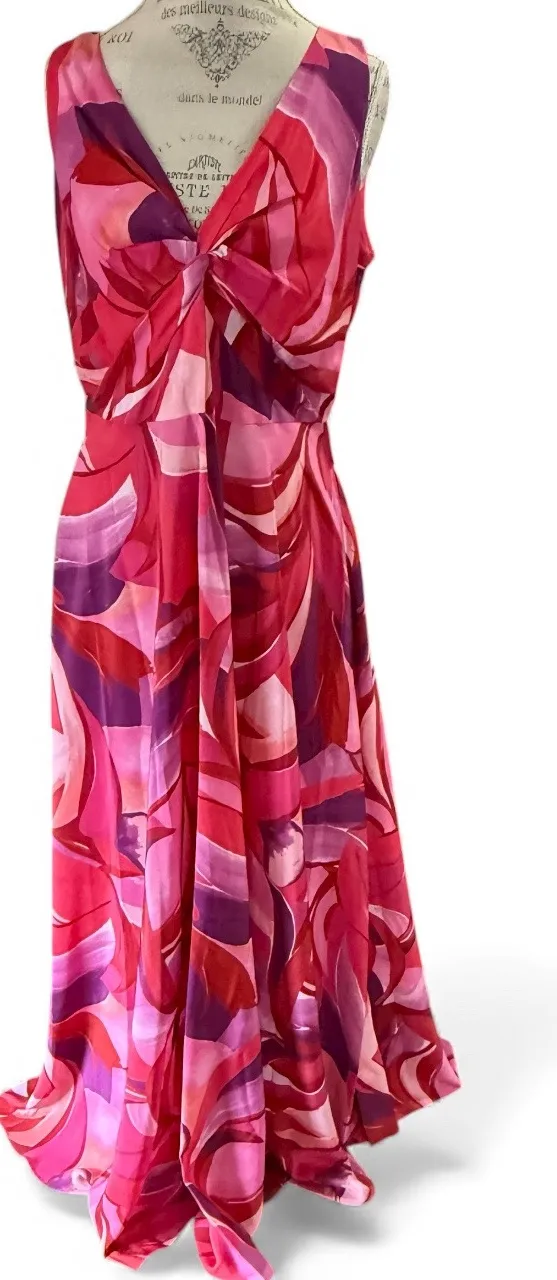 Colors are Fuchsia Pink Purple white Features: Crepe fabrication Swirl print Sheath silhouette V-neckline Sleeveless Lined Back zipper closure Approx. 60" length Polyester STYLE: EJ5M4219 SHELL: 100% POLYESTER LINING: 100% POLYESTER Tags: Abstract Art Deco Bridesmaid Black Tie Beautiful Barbie Barbiecore Classy Cocktail Colorful Contemporary Classic Clean Beauty Date Night Dinner Party Evening Floral Formal Girlie Jewel Tone Luxury Maximalist Preppy Posh Red Carpet Statement Sexy Sheath Sleeveless Summer Spring Special Occasion Timeless Vacation Wedding Guest Smoke free home measurements are in pictures and are approximate