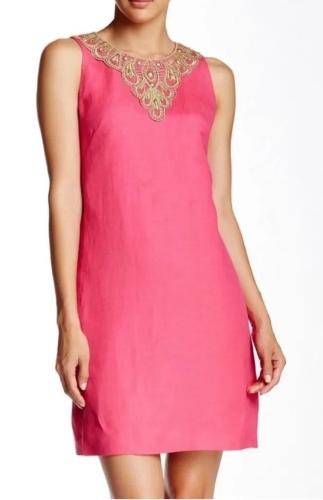 Brand: Eliza J Description: NEW WITH TAGS stunning linen blend pink and gold dress. Stunning gold embroidered and bead collar. Full back zipper. Stunning and lightweight. Fully lined. Brunch ready! No flaws found! Next day shipping!! Measurements taken with the item laying flat Size 12 P2P 20” Length shoulder to bottom 36 1/4” Tags: Linen designer streetwear brunch gold pink summer spring wedding bride sorority beach lake party bead debutante preppy A59
