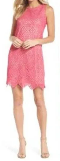 NWT Eliza J Sleeveless Lace Shift Dress In Hot Pink Size 0 Medallion lace enlivens a curve-skimming shift cut with an elegant jewel neckline and scalloped edging at the hem. Approx. Measurements: Top to Bottom Hem- 33 Inches Pit to Pit- 16 Inches Excellent Condition, Smoke Free Environment, Ships Next Business Day! Ask any question! Bundle & Save!