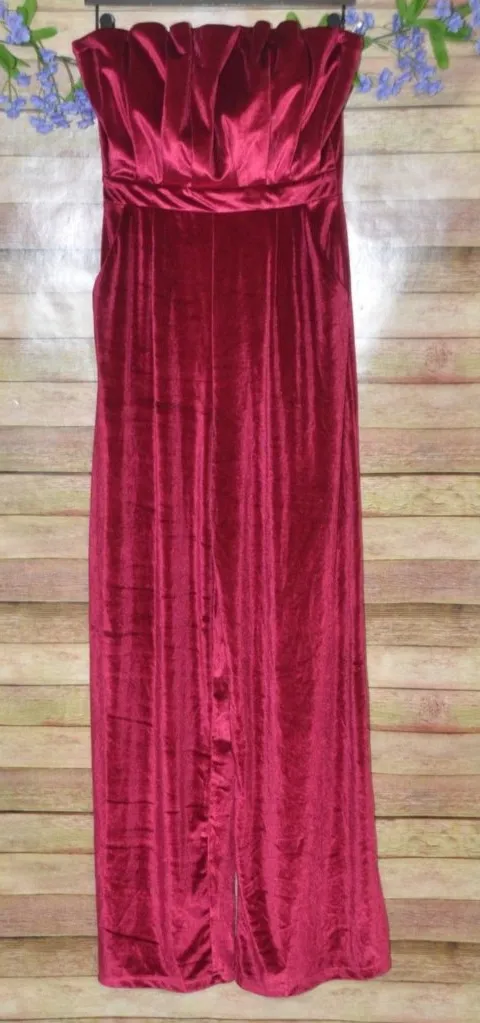 This stunning fuchsia pink velvet jumpsuit is perfect for a night out. It features a pleated bust an... Show more