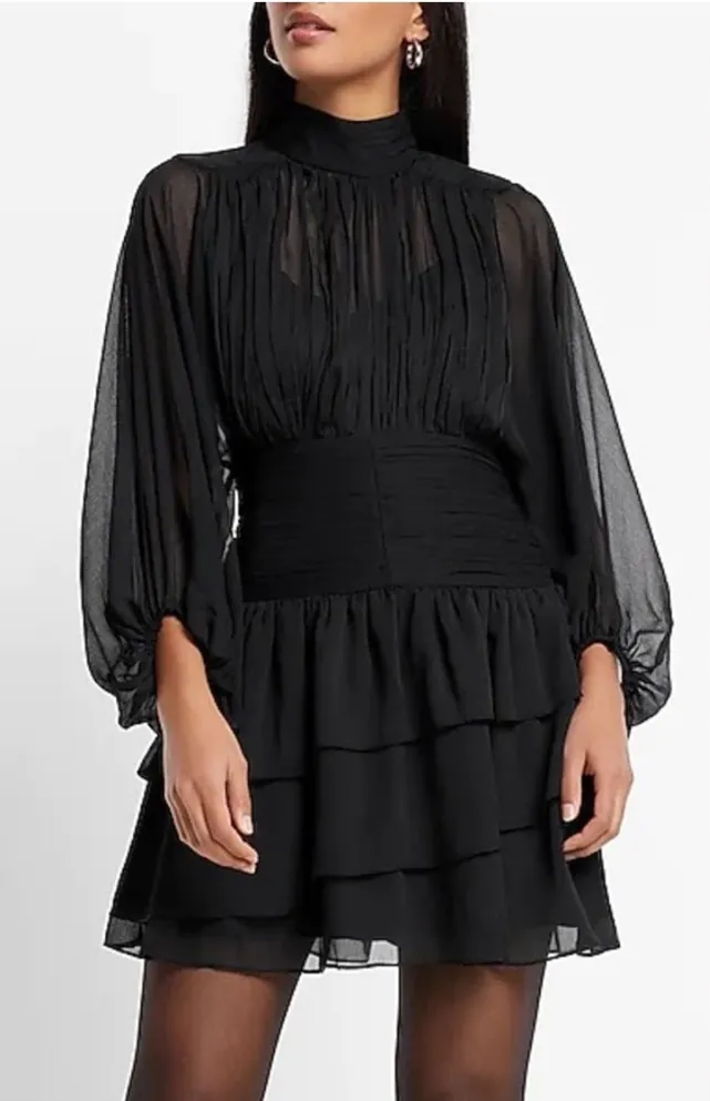 This stunning black dress from Express showcases a chic mock neck and elegant bishop sleeves, making... Show more