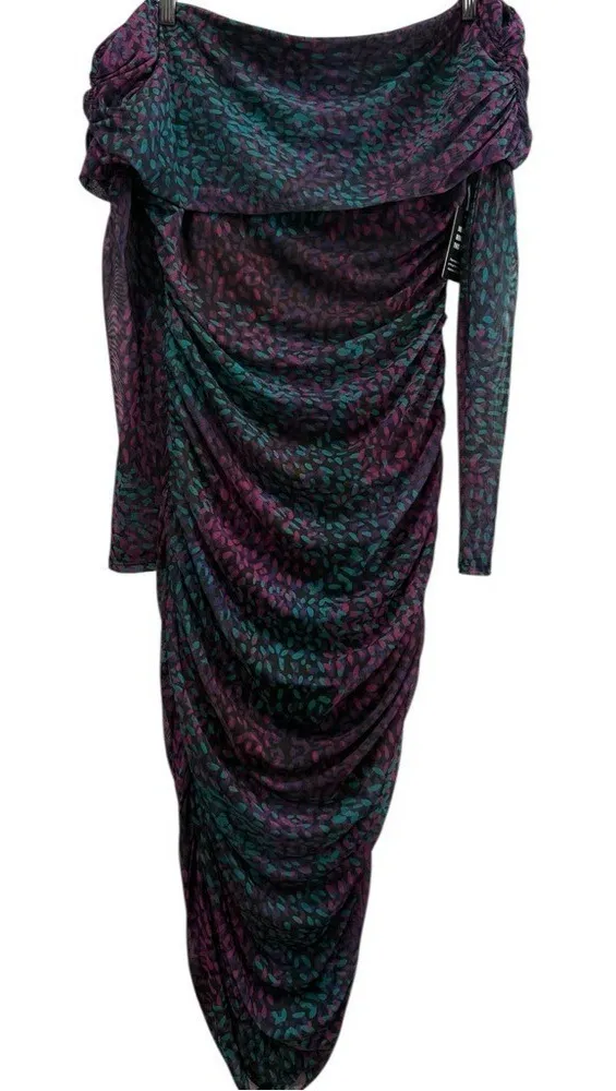 NWT Express Ruched Off the Shoulder Midi Dress Jewel Tone Abstract Print Large New with tags. Meas... Show more