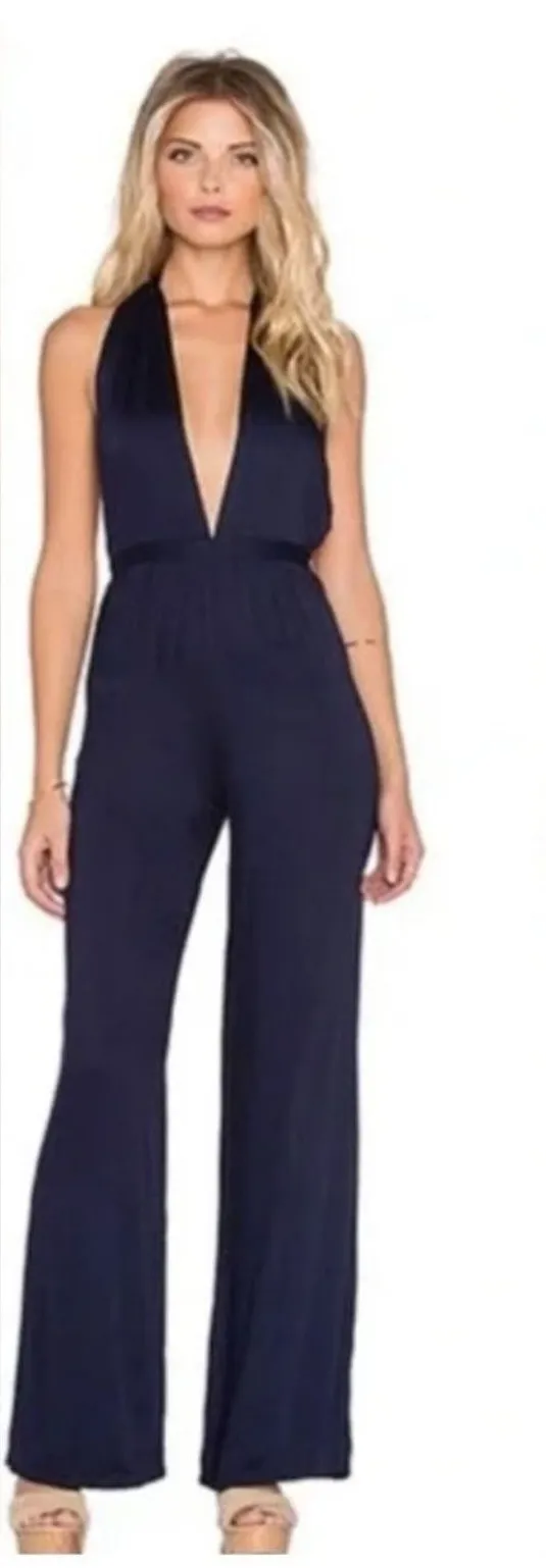 NWT Faithfull the Brand Cannes Halter Neck Flare Leg Jumpsuit L Blue Features: -Zipper and tie clos... Show more