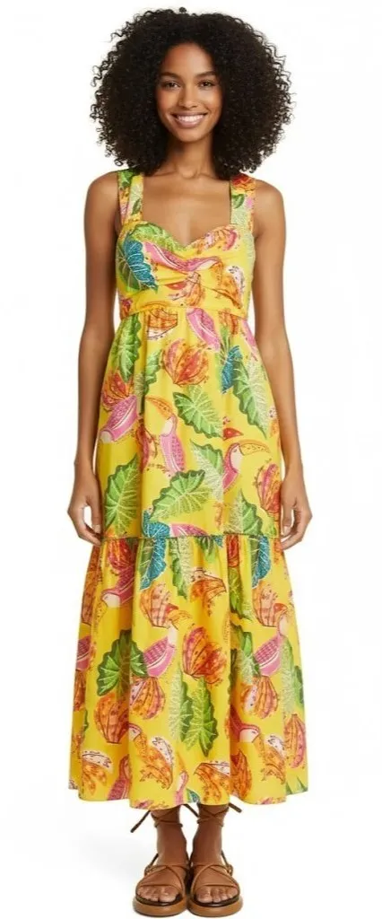 Up for purchase today is... Designer: Farm Rio Size: L Fit: Please do not rely solely on tagged size but rather check measurements listed below to determine if the item will fit. Color: Yellow Multi Style/Design #: 303126 Material: 100% cotton Details: * Get primed for a tropical vacation in this all-cotton dress decorated in a lively print and bow-tied at the open back. Sweetheart neck with shirred middle. Empire waist seam. Tiered A-line skirt. Fixed straps with 2-piece removable bow detail. Back zip. Unlined. Machine wash. Imported. * Condition: New with tags Retail: $235 Measurements: Chest - 40" Waist - 33" Length - 55"