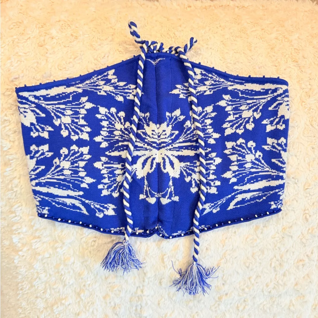 Vibrant blue and white crop top with floral design. Features braided straps and tassel details. Perfect for a chic look. The strings at the top go around the neck - this is a light sweater material. Darling on and perfect for your winter vacation! Measure is on photo.