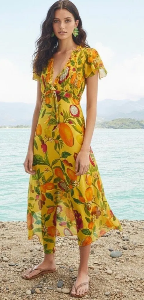Up for purchase today is... Designer: Farm Rio Size: L Fit: Please do not rely solely on tagged size but rather check measurements listed below to determine if the item will fit. Color: Yellow Motif Style/Design #: 291085 Material: 100% viscose Details: * The Fruit Lovers Maxi Dress is a flowy piece to wear all Summer long (this year and in the next ones as well!). It has a more smocked fitted bodice, so that you can feel cozy while showing some skin. Smocked bodice. Ties at waist with beaded tassels. Deep V neckline with ruffled detailing. Short flutter sleeve. Concealed side zipper. Lined. Hand wash. Imported. * Condition: New with tags Retail: $265 Measurements: Chest - 38" Waist - 32" Length - 54"