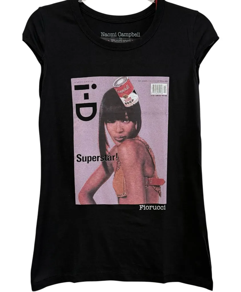 NWT Fiorucci Naomi Campbell Soup Can Black Graphic Cap Sleeve Babydoll Tee Shirt Small $128 New with tags! Measurements laying flat Across chest underarms 18” Length 27” ⭐️⭐️Trusted seller, non-smoking home, fast shipping⭐️⭐️