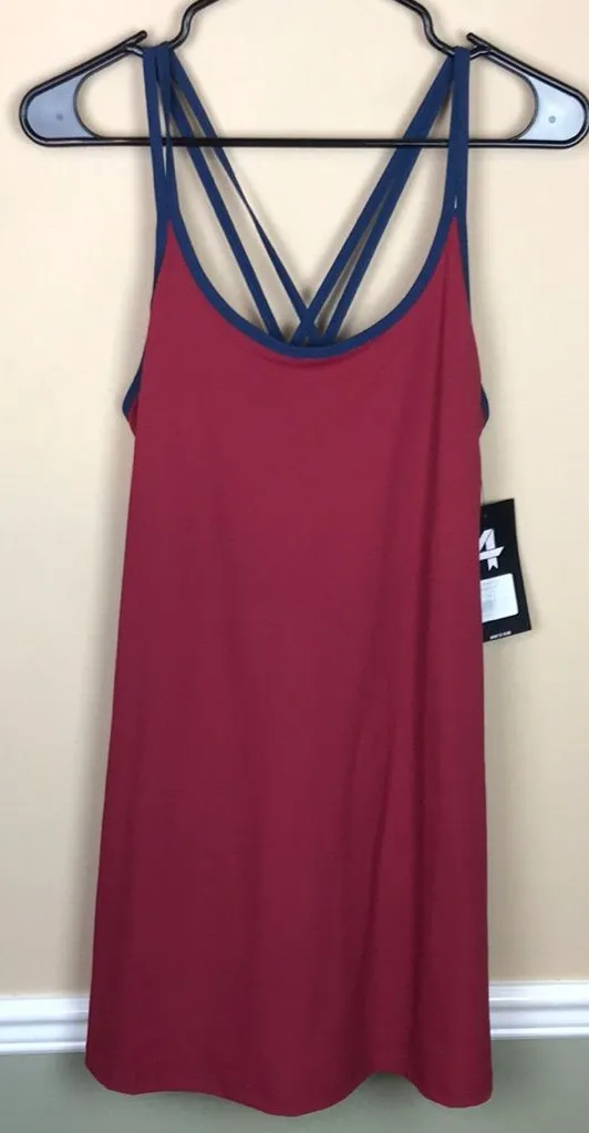 New with tags. 75% Recycled Nylon; 25% Spandex. Maroon red and navy blue. Double crossover straps. Wicking, 4-way stretch fabric. A pocket on each side. Cellphone pocket on liner. UPF Protection. Approximate measurements: Pit to pit - 18” Shoulder to bottom hem - 34”