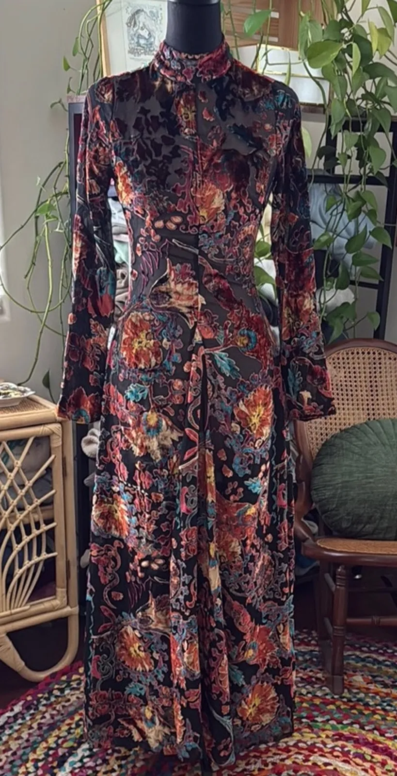 NWT. Velvet. Side zip. High neckline with buttons at back of neck. Open back. Godet insert. Lined. V... Show more