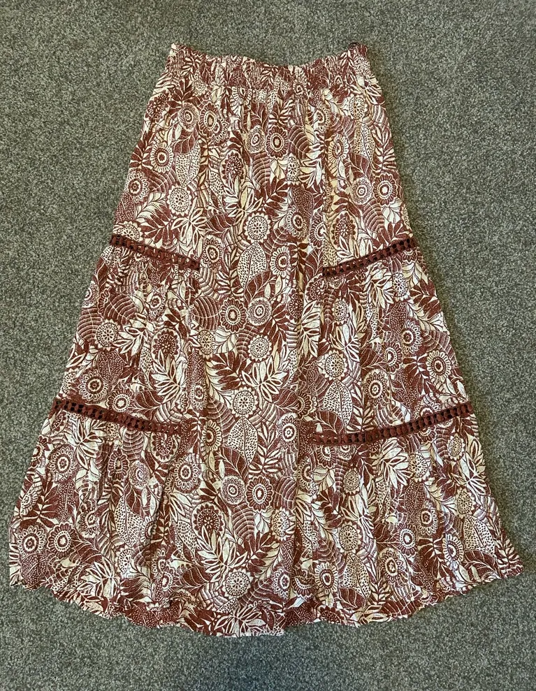 Elegant floral skirt in brown and white. Perfect for any occasion. Beautiful lace detailing. New wit... Show more