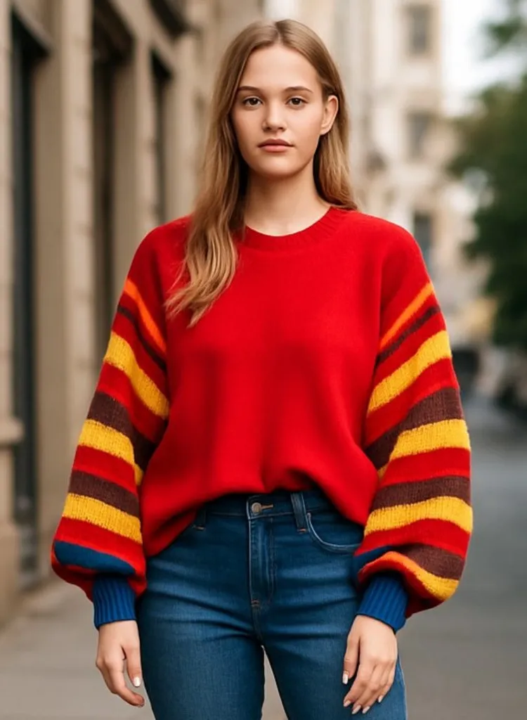 A colorful pattern and batwing sleeves add boho flair to this stylish knit pullover. Fit: This styl... Show more