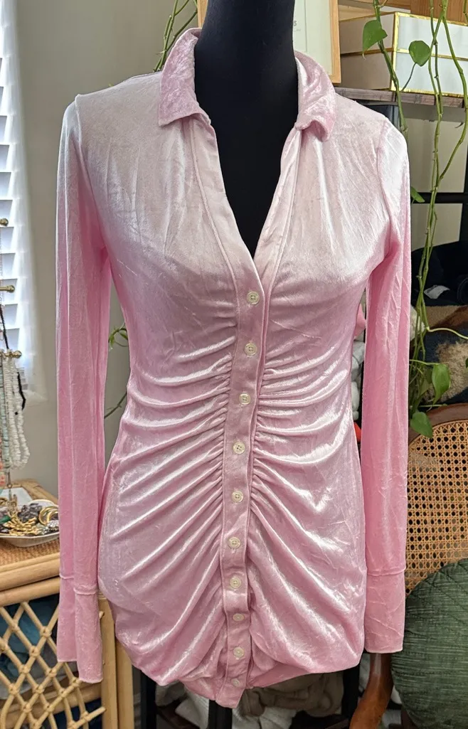 NWT. Pink. Button up. Ruched front. Long sleeve. Lined. Poly blend. Size XS. Excellent NWT condition... Show more