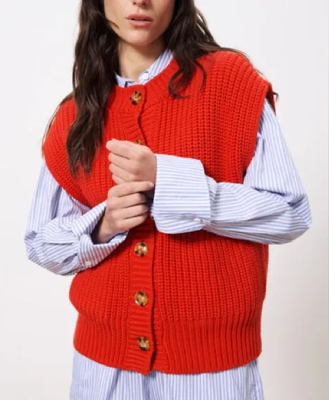 NWT FRNCH Carmele Chunky Knit Sweater Vest Sleeveless Cardigan Red Size Small New with tags Approximate measurements: Length: 23” Bust: 40” The FRNCH Carmele Red Tank Top Sweater is the perfect layer for those Spring mornings. A loose knit in a gorgeous bright red colour, it has two pockets and a round neck