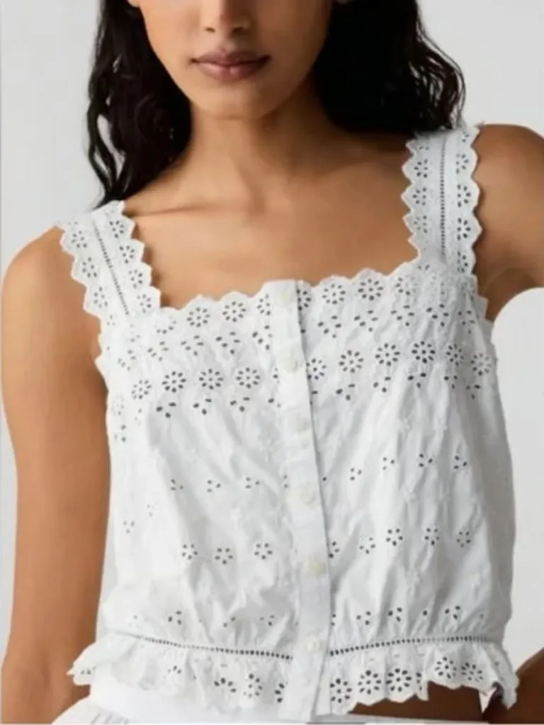 Up for purchase today is... Designer: GAP x Doen Size: S Fit: Please do not go by size number but rather check measurements listed below to determine if the item will fit. Color: White Style/Design #: 417144 (Su 24) Material: 100% cotton Details: * Iconic essentials meet coastal California classics. Inspired by nostalgia, made with feminine details, meant to be worn & lived in. It's an absolutely darling, feminine top that can be dressed up on dressed down. Soft cotton cropped tank top. Square neck with scalloped detailing. Tank straps. Button front. Allover eyelet detail. Unlined. Machine wash. Imported. * Condition: New with tags Measurements: Chest - 35 ½" Waist - 32" Length - 18 ½"