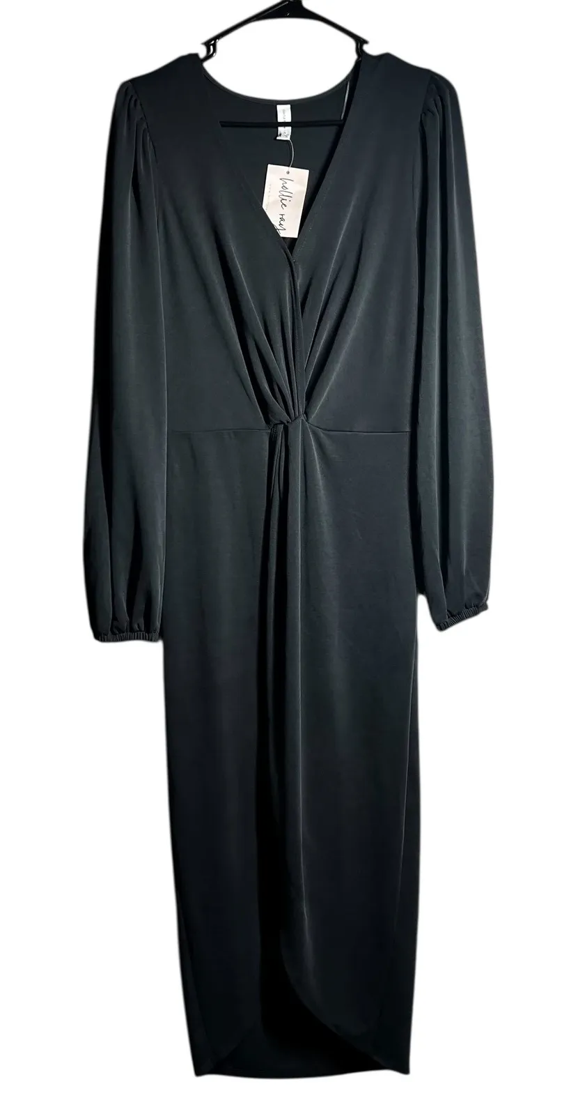 A sophisticated black midi dress from Gentle Fawn. This dress features a flattering v-neckline with a chic twist front detail and long, voluminous sleeves. The elasticized waist ensures a comfortable and flattering silhouette, while the midi length with a subtle high-low hem adds modern elegance. Perfect for a dinner date, a special occasion, or a stylish evening out. Style: Wrap Dress Dress Length: Midi Department: Women Sleeve Length: Long Sleeve Pattern: Solid Occasion: Party/Cocktail, Casual Material: Modal, Polyester Fabric Type: Knit Neckline: V-Neck Season: Fall, Winter, Spring Sleeve Type: Balloon Sleeve Closure: Pullover Accents: Pleated Features: Stretch, Ruched Keywords: Gentle Fawn, black dress, twist front, long sleeve, midi dress, v-neck, elegant, evening wear, cocktail dress, sophisticated, women's fashion, new with tags, modal blend Approx.Measurements
