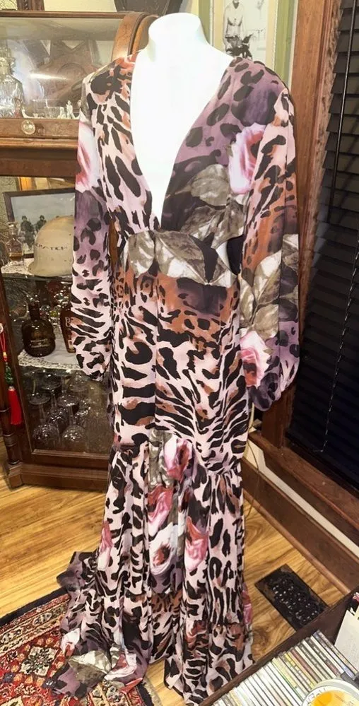 NWT GIFFNISETTI Sexy Leopard Print Long Sleeve Ruffle Hem Dresses Party Maxi Dress Side cut off window ( waist area) Elegant Flowy Chiffon Lightweight This dress has a little flaws on side of skirt need to be fix it.