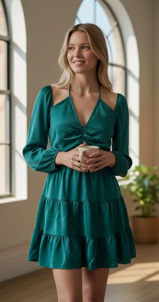 Features a ruched sweetheart neckline, delicate spaghetti straps, romantic long puff sleeves, and flowy tiered skirt. Perfect for holidays, date nights, or special occasions. Lightweight, silky fabric with a subtle sheen.