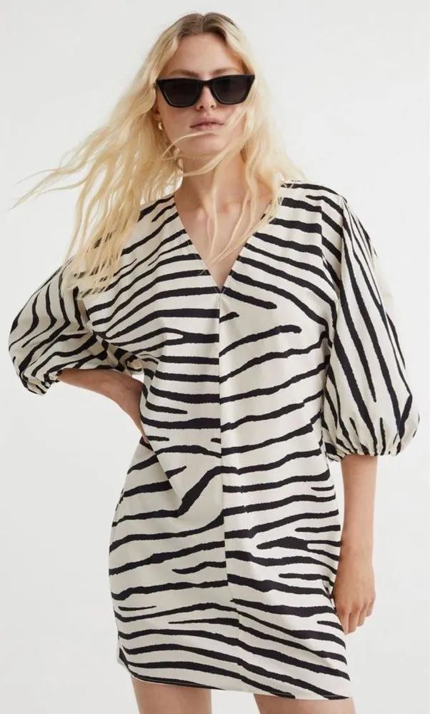 NWT H&M Zebra Striped Puffy Sleeve Dress Cream and Black Small No flaws Mini dress Vneck Chic, go... Show more