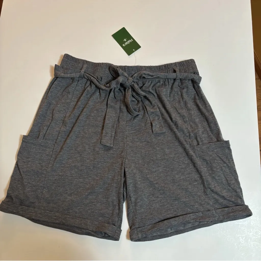 Chic charcoal cargo shorts with a drawstring belt and elastic waist. Ideal for casual outings. Cuffed and has pockets. Soft stretchy cotton material, like a t shirt material. NWT Halara High Waisted Belted Pocket Casual Shorts in size Small are a stylish and comfortable choice for the summer season. Made from a polyester blend material, these gray shorts feature an elastic waist and belted design for a personalized fit. The cuffed hem adds a trendy touch, while the pockets provide practicality for everyday wear. Perfect for casual occasions and walking activities, these shorts are a versatile addition to any woman's wardrobe. These shorts are comfy, modern, contemporary and stylish! Longer inseam for nice coverage