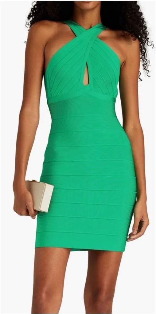 A minidress is framed with an X-shaped neckline offers a sleek style for a night out. Made with our signature bandage. Designed to shape and sculpt the body, this cut features a keyhole halter neckline 34" length (based on size small) V-neck Sleeveless Bandage Concealed hook and zip fastening at back Stretchy fabric 90% rayon, 9% nylon, 1% spandex Dry clean Imported Style OPC8369617-303