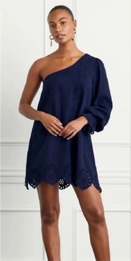 NWT Hill House Mila Dress One Shoulder Navy Linen Blue Eyelet Embroidery - Size: Small - Condition:... Show more