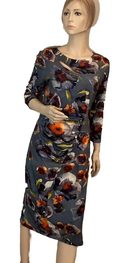 Hilton Hollis floral midi dress in size L. The dress features a round neckline, 3/4 sleeves, and a pullover closure. Perfect for any occasion, whether it's a wedding, party, or work event, this dress is versatile and stylish. Crafted from a blend of polyester, spandex, and viscose, the dress has a jersey fabric type and is easy to care for with dry cleaning only. The dress has a beautiful gray color with a floral pattern, making it perfect for any season. Add this dress to your collection for a chic and sophisticated look. NEW WITH TAGS $495