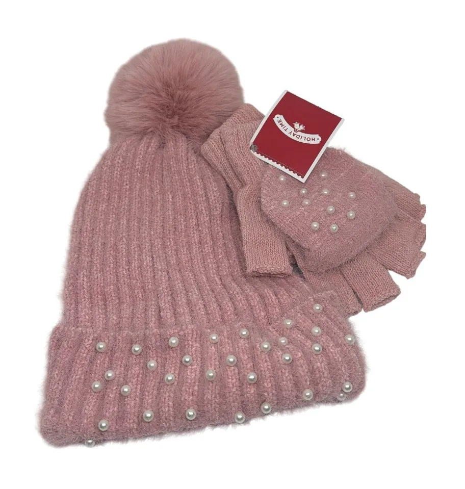 Holiday Time pink winter accessory set including a pearl-embellished beanie with pom pom and matching fingerless gloves. Soft, cozy knit in a one-size fit. Perfect for cold-weather wear or gifting. • Pink knit beanie and gloves • Pearl-embellished design • Cute pom-pom top beanie • Great for winter or gifting • Soft, warm knit fabric 📏 SIZE: One Size ✅ CONDITION: New With Tags (NWT) holiday time set, pink pearl beanie, winter hat glove set, womens knit beanie, pearl pom pom hat, fingerless gloves women, one size winter set, pink winter accessories, NWT hat gloves, cozy winter wear TAGS: #HolidayTime, #WinterAccessories, #BeanieSet, #PinkKnit, #PearlBeanie, #FingerlessGloves, #WinterStyle, #NWT, #CozyWear, #ColdWeatherFashion temp4
