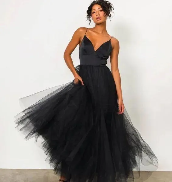 The Hutch Lucia Maxi Dress is a stunning addition to your wardrobe. Crafted by the renowned brand Hutch, this dress is perfect for women seeking trendy yet comfortable clothing options. Available in an elegant black color and a flattering V-neck design, this dress is bound to turn heads at any occasion. The Hutch Lucia Maxi Dress has been thoughtfully designed with attention to detail. It features built-in molded cups for added support and a flattering silhouette. The mesh skirt adds a touch of sophistication, while the pleated flare hem adds a fun and flirty element to the overall look. Measuring approximately 54 inches from shoulder to hem, this dress provides the perfect length for a maxi dress. The left side on-seam zipper ensures easy and convenient wear. Made from a mix of 95% polyester and 5% spandex, the Hutch Lucia Maxi Dress offers both comfort and stretch.