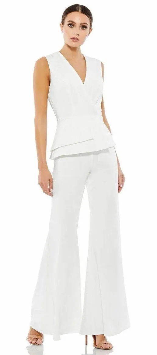 Drape yourself with the chic style of this Mac Duggal 26602 creation. Meticulously tailored lines embrace the feminine form, showcasing the grace of crepe fabric in a sleeveless design. The faux wrap bodice, adorned with a V-neckline, exudes timeless elegance. A peplum accent gracefully wraps the waist, enhancing the silhouette. The full back, coupled with a concealed zipper closure, ensures a seamless finish. Transitioning seamlessly into flared pants, this ensemble epitomizes modern chic with a touch of classic allure. Embrace unparalleled grace and poise in the Mac Duggal 26602, where each detail harmoniously contributes to a captivating ensemble. Model is wearing the White color. Style: macd_26602 Fabric: Crepe Fabric (100% Polyester) Details: Sleeveless, Faux Wrap Bodice, Peplum Accent, Full Back, Concealed Zipper Closure, Flared Pants Length: Long Neckline: V-Neck Waistline: Natural Silhouette: Jumpsuit