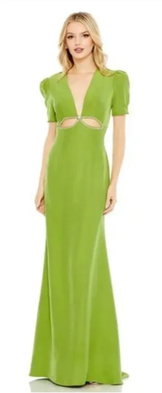 leena for Mac Duggal 100% Polyester Fully lined V-neck Short puff sleeve Front cut-out detail Embellished cut-out detailing Back zipper Approx. 62.5" from top of shoulder to bottom hem Style #2630 Size 4 Measures 17" across the chest Waist 14" New with tags $498
