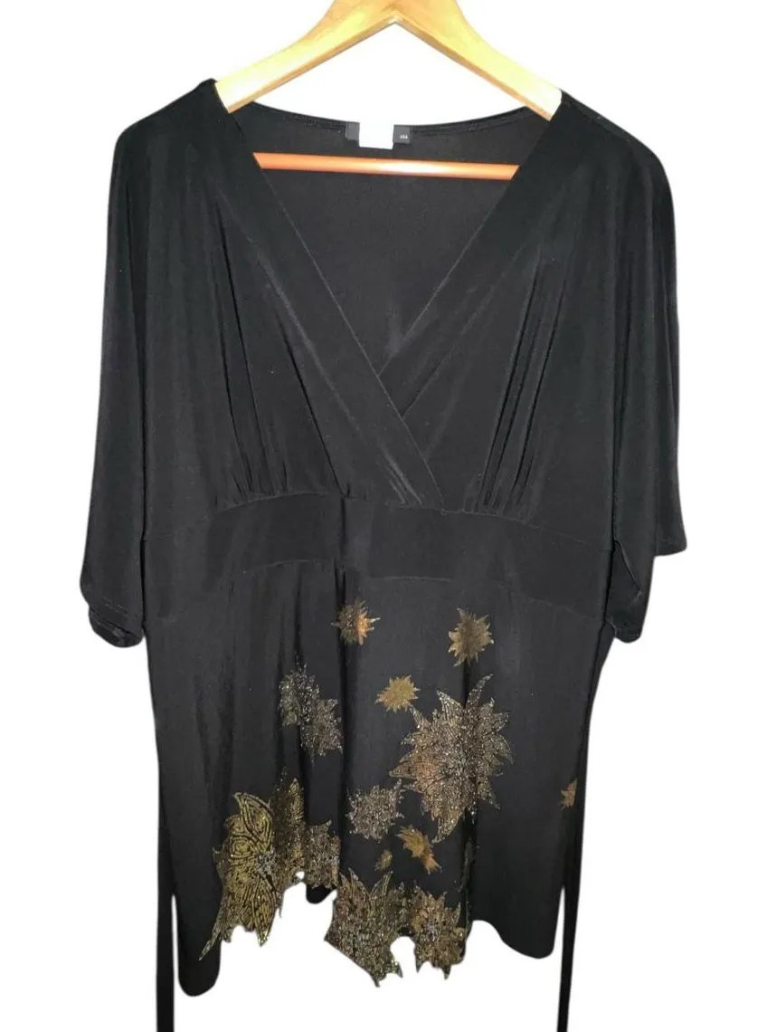 NWT ING Plus women’s blouse in size 3X, made in the USA. Features a soft, stretchy fabric with a flattering empire waist and adjustable tie-back detail. Designed in classic black with a striking gold leaf-inspired floral print and subtle silver accents along the hem. Made from 92% polyester and 8% spandex for a smooth, comfortable fit. New with tags and in perfect condition—ideal for evening wear, holidays, or adding a touch of elegance to everyday outfits. #PlusSizeStyle #NWT #GoldDetail #MadeInUSA #ElegantChic