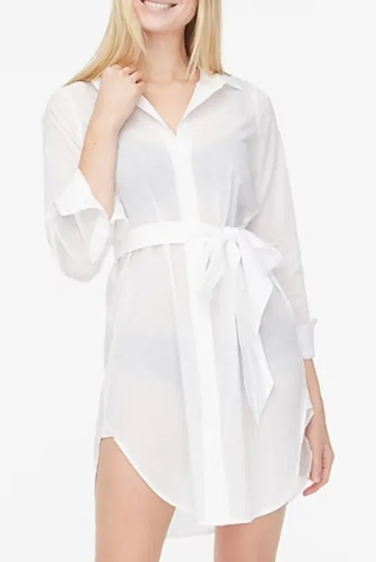 Size Large L New with tags. No flaws. Shirt dress Mini, above knee length Solid white color Button closure Long sleeves Lightweight, breathable Semi-sheer Collared Belted, tie waist 100% organic cotton RETAIL $89.50 Tags: resort, tropical, neutral, classic, timeless, natural fiber Bust: 21,5" Length: 37" Not sure if it will fit? Measure 1 or 2 of your favorite clothing items and compare. Measurements are approximate flat-lay.