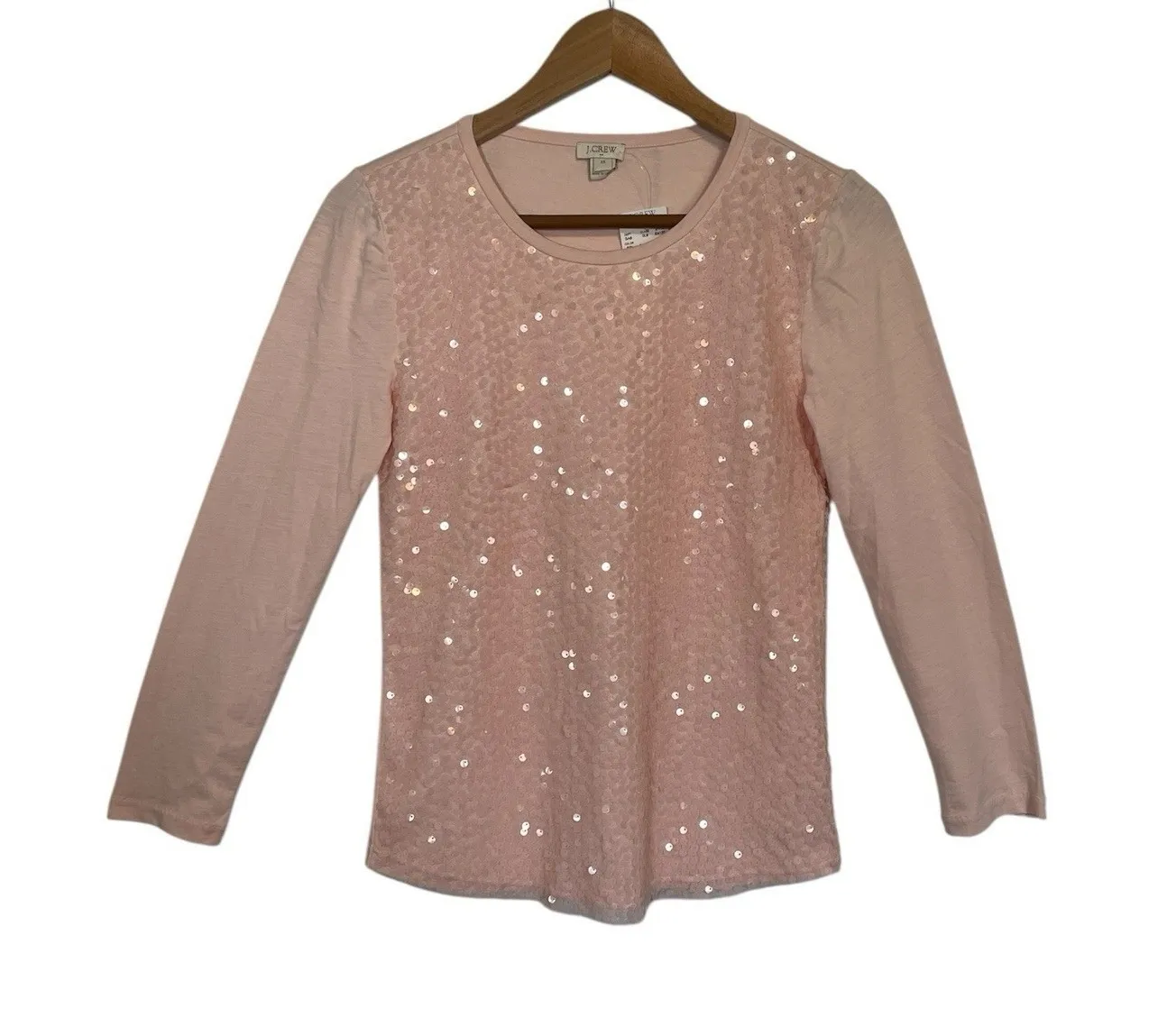 J.Crew Women's Size XS Pink Metallic Popover Shirt Top Blouse NWT Measurements: • Chest: 15 inches • Sleeves: 21 inches • Full Length: 24 inches Keywords: J. Crew, sequin top, long sleeve, pink blouse, crewneck, casual top, womens top, party top, sparkle top, size XS, holiday top, blouse