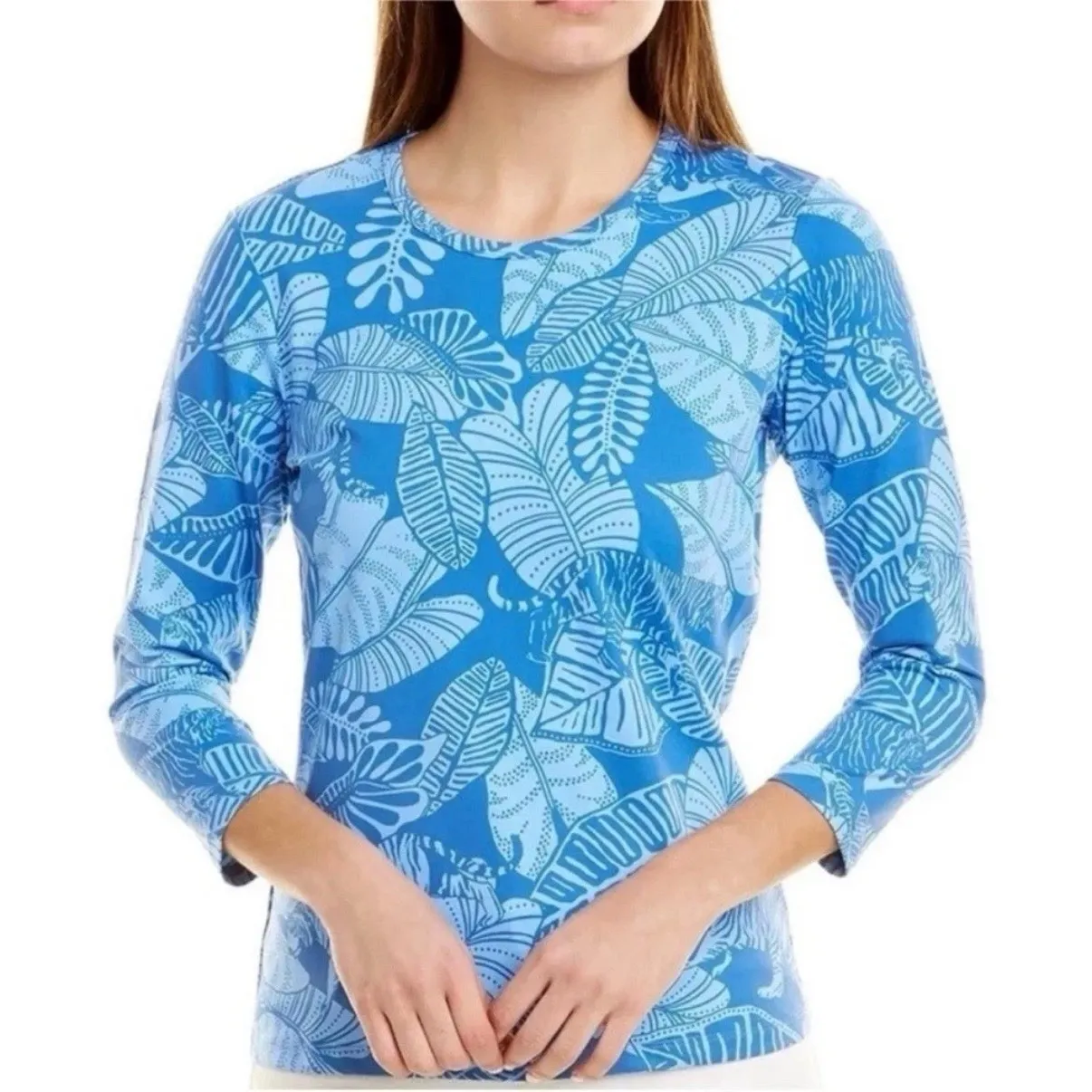 Crew neck 3/4 length sleeve Pullover Catalina Cloth@ (JMC Fabric) 91% Nylon, 9% Spandex Hand wash cold. Lay flat to dry. New with tags, no flaws Approximate measurements laying flat: 19" armpit to armpit 13" sleeves 24" length Colors may slightly vary depending on lighting & screen settings Clean, smoke free, pet free environment Same day or next day shipping Offers welcome and will be considered