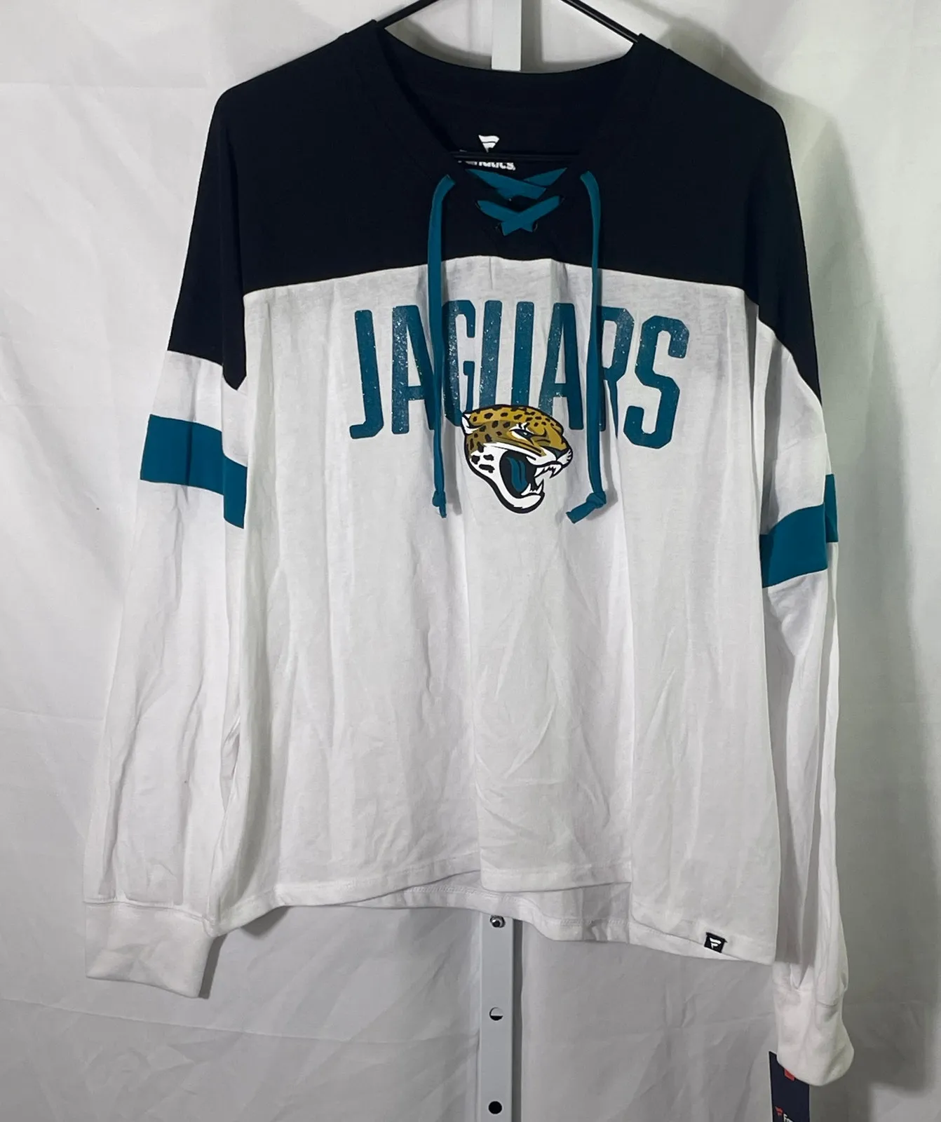 NWT Jacksonville Jaguars NFL Fanatics Tee - Womens Size XL - Black - Teal - Jaguarss logo on front (jaguars is metallic) - PTP: 26", Length: 25" - 50% Cotton, 50% Polyester - Long sleeve - Ties on front - Jacksonville Jaguars, Jacksonville Jaguars gear, Jacksonville Jaguars NFL tee, Jacksonville Jaguars sportswear #DUUUVAL #jags #jax