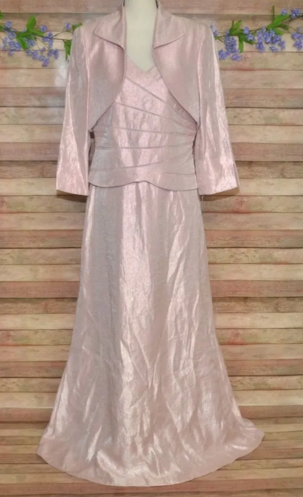Elegant pink maxi gown with a matching bolero jacket, perfect for formal occasions. Features a back zipper, long sleeves, and an open-front design. Ideal for mothers of the bride or evening events. • New with tags • Jessica Howard brand • Size 12 • Long sleeve bolero jacket • Back zipper closure • Formal evening wear Keywords: mother of the bride, mother of the groom, grandmother of the bride, grandmother of the groom, wedding guest gown, formal gorm, pink gown, formal dress, formal event wear, cruise dress, party dress, party gown, maxi gown, maxi dress, dress and jacket Location: Hanging 4 Please SEE measurements of the clothing items to insure fit! Measurements are in the last photo. To check measurements, measures a well fitting garment laying flat unstretched. We double the measurement for bust/chest/waist/hip/thigh and leg opening. Length is measured from shoulder to hem. Inseams are measured along the inseam. When you see TWO measurement for one area it is because the item has stretch and one is laying flat and the other is stretched. 🙂 Size: Womens 12 Condition: New With Tags