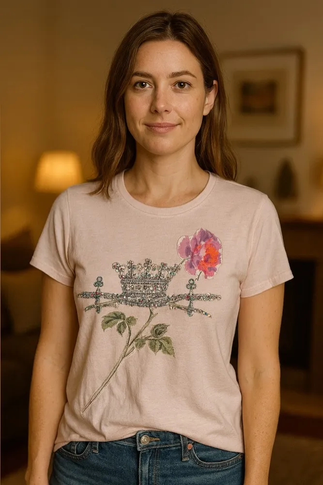Add a touch of bohemian edge to your wardrobe with this Johnny Was For Love & Liberty Crown and Dagger Tee in light pink, size medium. Crafted from 100% cotton, this NWT (New With Tags) top features a crystal-embellished crown and rose appliqué on the front, paired with an intricate “For Love and Liberty” graphic on the back. The unfinished rolled hem and sleeves lend it a relaxed, lived-in vibe, while the high-quality detailing adds luxury flair. Perfect for styling with denim or layering under a jacket for that effortlessly chic look. Details: • Size: Medium • Color: Light Pink • 100% Cotton • Crystal and appliqué embellishments • Short sleeve, unfinished rolled edges • Rear full graphic: “For Love and Liberty” • NWT (New With Tags) Small mark on left shoulder. See pic. Has not been treated or washed since it is NWT. Johnny Was tee, For Love & Liberty shirt, embellished graphic tee, crystal rose applique, pink cotton shirt, designer t-shirt, boho chic top, statement tee, edgy feminine style, casual luxury fashion, crown and dagger design, lightweight cotton top, boutique clothing, women’s medium tee, festival fashion, Johnny Was graphic top. 3