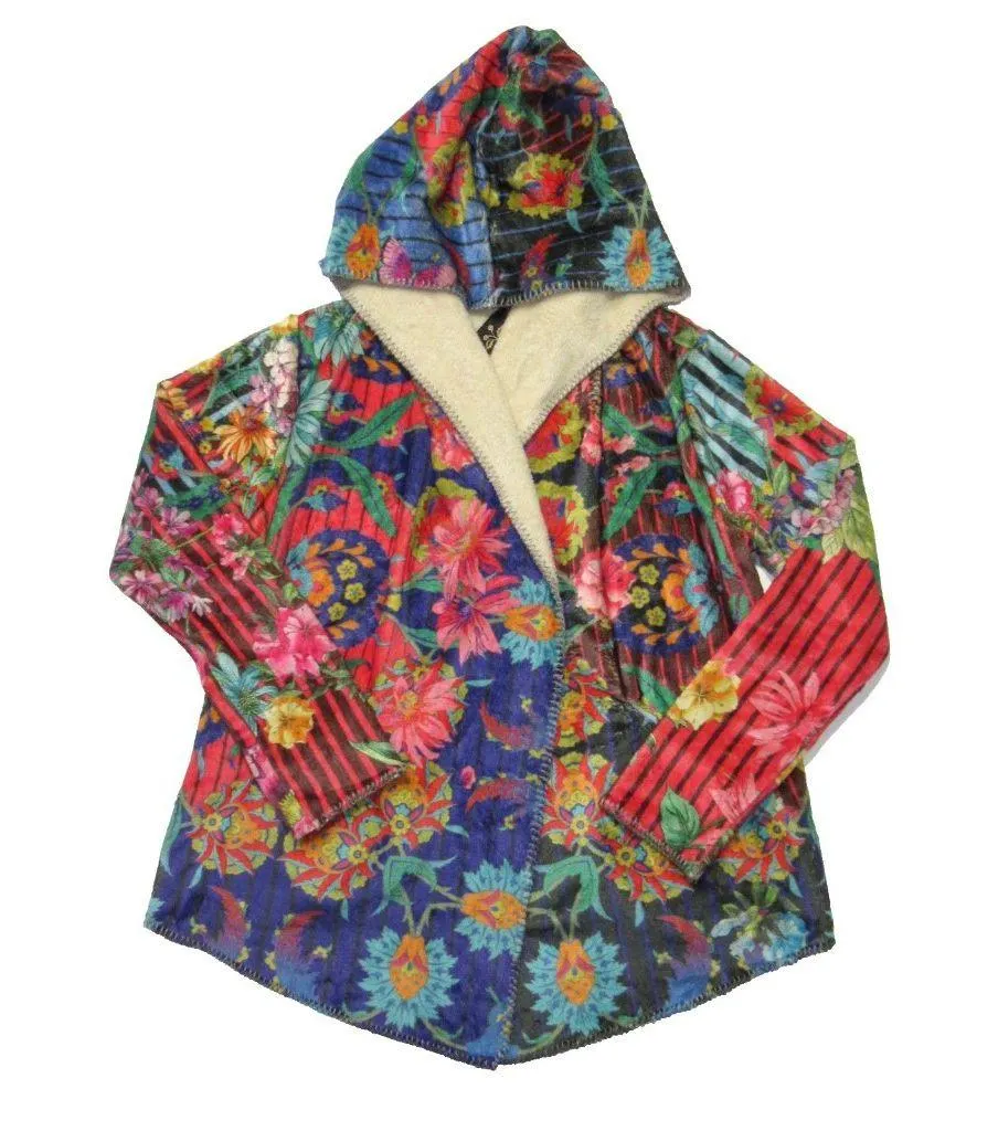 Up for purchase today is... Designer: Johnny Was Size: S Fit: Please do not go by size number but rather check measurements listed below to determine if the item will fit. Color: Multi Style/Design #: R43222 Material: 100% polyester Details: * A cozy statement style, the Rico Sherpa Jacket will keep you warm in the cooler months. Featuring a draped open front with a unique angled hemline, this hooded jacket is the perfect blend of form and function. Long sleeves. Side pockets. Dry clean. Imported. * Condition: New with tags Retail: $205 Measurements: Shoulder - 18" Chest - 42" Waist - 41" Length - 25 ½"