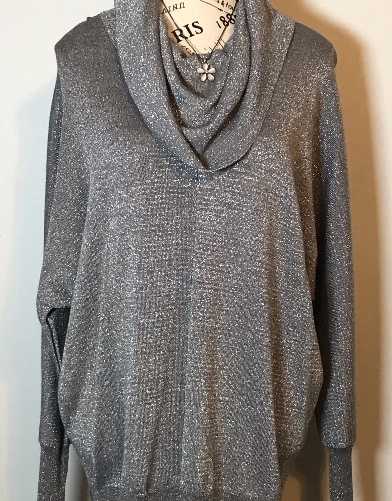 Joseph A. Sparkly Ladies Silver Gun Metal Top, a versatile piece that’s ready to light up a room when you walk in. Crafted from a luxurious blend of rayon, polyester, and metallic threads, the sweater presents a striking gun metal/silver metallic color that catches the light for a subtle sparkle. The tight-knit Sparlkly top will catch attention. Bust measuring 24” length 27” sleeves 26”. New w/tags. New years Eve 🎉