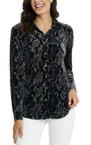 A sophisticated Jude Connally Brandy Velvet long sleeve button-up shirt in a striking snakeskin pattern. Its classic rhinestone jewel button-front design and flattering silhouette make it a versatile addition to any wardrobe. Size XL New with tags. No flaws. Approx 29" long x 23" across chest Type: Button-Up Material: Velvet, Polyester, Spandex Neckline: Collared Sleeve Type: Classic/Fitted Sleeve Pattern: Animal Print Accents: Button Theme: Snake Features: Stretch Fit: Classic Keywords: Jude Connally, Brandy Velvet, Snakeskin Print, Black Shirt, Velvet Shirt, Long Sleeve, Button Up, Women's Fashion, Designer Shirt, Luxury Apparel, Statement Top, Party Wear, Evening Attire, Sophisticated Style, Jude Connally, Brandy Shirt, velvet snakeskin, jewel buttons, black top, size XL, NWT, luxury blouse, party top, holiday velvet, designer shirt