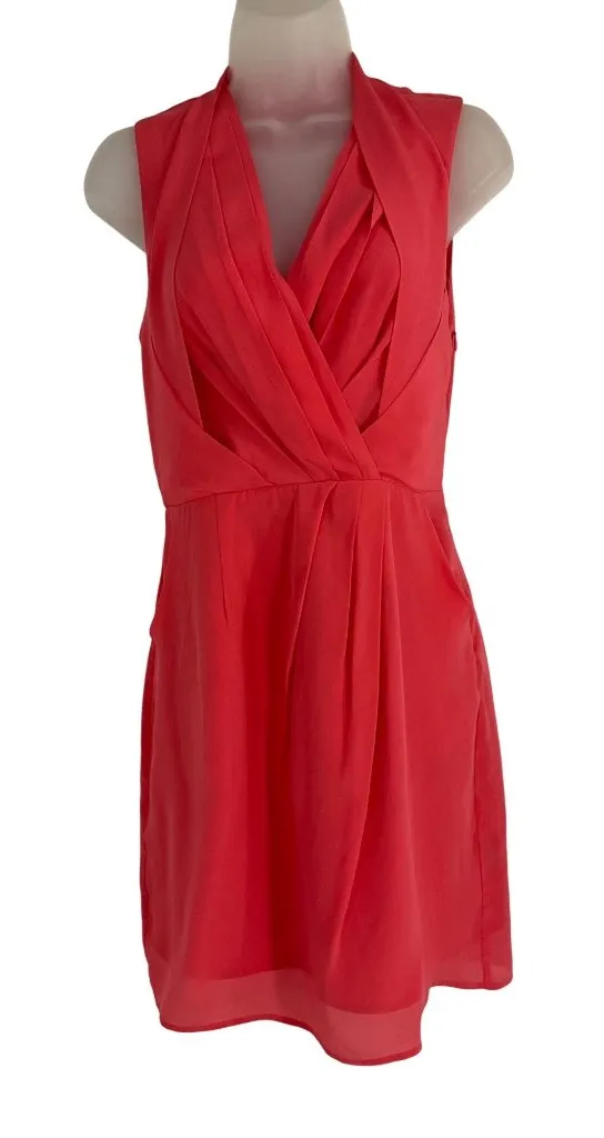 Elevate your wardrobe with this chic coral silk dress. Featuring a wrap-style front, pockets for con... Show more
