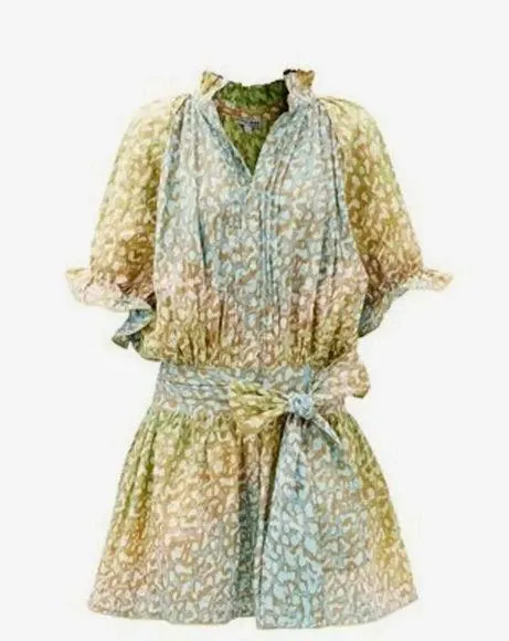 Colorway is green, lime, and turquoise Lightweight tie-dye and snow leopard-print cotton Ruffled high neck Mid-length ruffled sleeves Dropped waist, tie-fastening belt Flared skirt Front buttons, pintuck placket Made in India 100% Cotton Brand size 2, equates to a US size 4-6 per their size chart Measurements~~ 18" Pit to pit 36" Length Excellent condition, no flaws