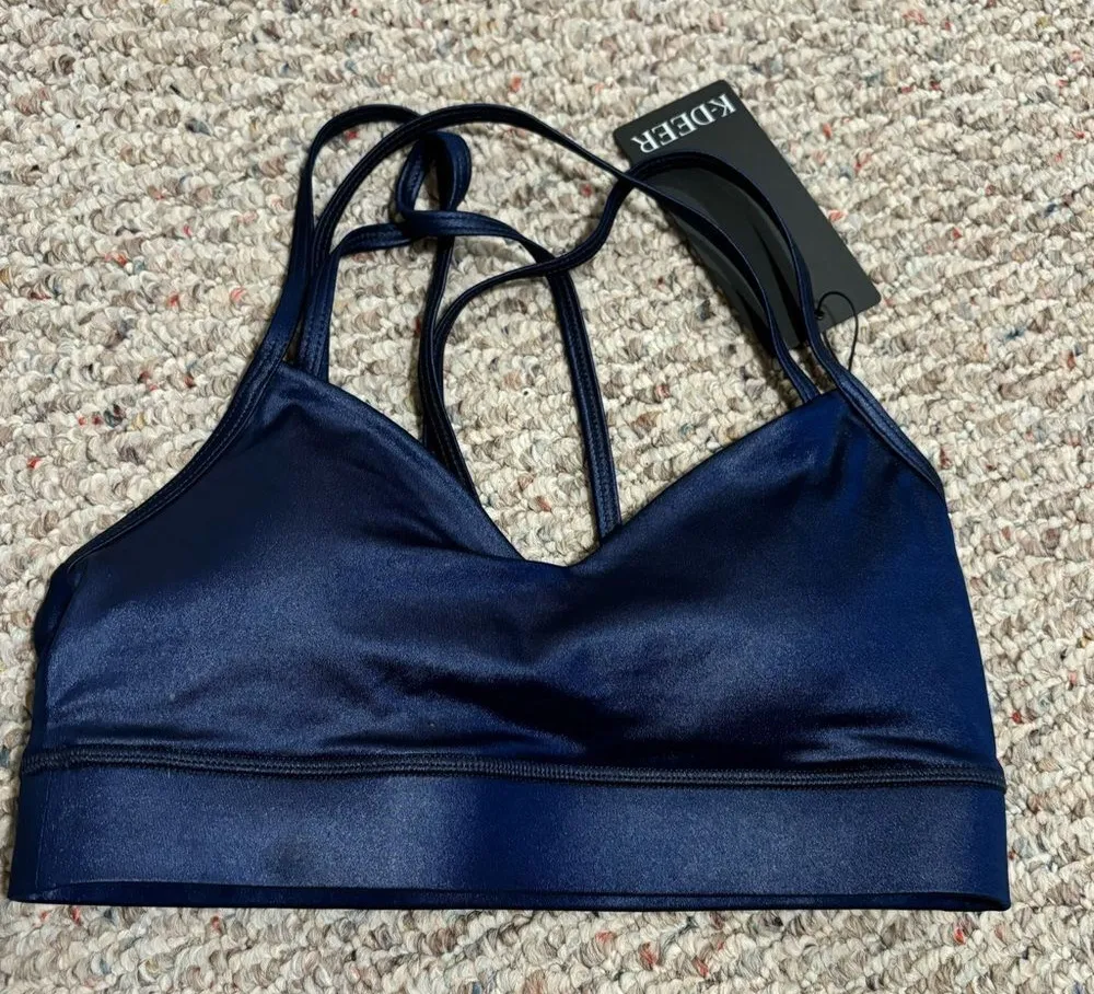 NWT K-DEER Hi-Luxe Polished Criss Cross Sports Bra Bright Royal Blue Size Medium Brand new with tags- never worn. There’s some tiny specks as pictured on the front but noticable and would probably come out in the wash Embrace your inner mermaid! Finished with a chic shimmer, our Polished collection is reminiscent of a pearl's smooth and luxe look - now in rich jewel tones. Our Criss Cross sports bra has a slight V-neckline and thin straps that run parallel over the shoulders and intersect at the center of your back. The medium support is perfect for yoga, barre and spin classes. *May bleed if washed or worn with light colors* Fit Medium Support & Coverage V-Neckline Removable Cups Thin Straps Fabric Signature 4-way stretch Nylon/Spandex Quick dry, moisture wicking technology UPF 50+ sun protection H20 friendly Care Hand wash cold, hang dry for lasting elasticity and color vibrancy Sensitive to rough surfaces, no sitting on velcro or concrete!