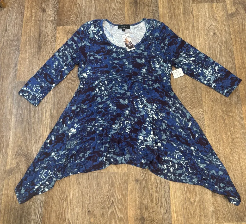 Brand new with tags Karen Kane tunic featuring a blue and white print and a relaxed, flowy fit. Made from lightweight fabric that drapes beautifully — perfect for layering or wearing on its own. Designed with effortless style and comfort in mind, making it an easy piece to dress up or down.