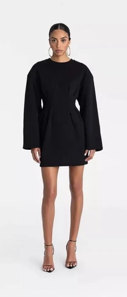 This comfortable black dress is perfect for any occasion. Its sleek design offers a timeless look that is both stylish and versatile. It’s a sweatshirt dress! Fleece inside. NWT stylish and chic. Designer dress in comfortable sweatshirt feel