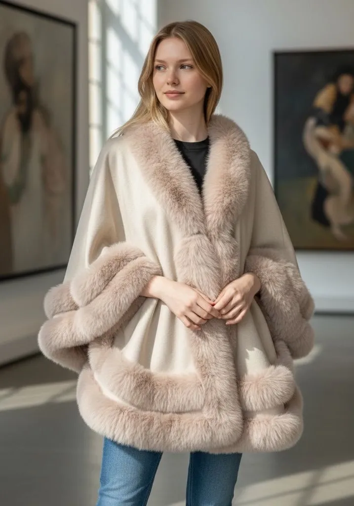 NWT LA Fiorentina cape poncho Capelet shrug blanket ruana coat Fur Trim OS Tan Size undefined - $75 New With Tags - From Smriti
