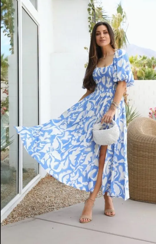 New with tag Size M Color blue and white A smocked bodice renders a curve-hugging silhouette on a floral-printed silk dress framed with artfully puffed sleeves. Size M: length 45 in Tags: Influencer Statement Piece, bridesmaids, black tie, gala, formal wear, prom, homecoming, pageant, wedding guest, bridal, wedding, bridal shower, mother of the bride, mother of the groom, rehearsal dinner, bachelorette, pageant, prom, homecoming, wedding, engagement photos, special occasion, little black dress, gala, Graduation, holiday parties, pageant, Quinceañera, formal, black tie, cocktail, Maid of honor, Special occasion, Designer Event, Dinner gown, Photo shoot, Formal event, Celebrity Red Carpet Luxe Luxury, Holiday, Vacation Resort wear, Beach dress, Spring, Summer, Fall, Winter, viral