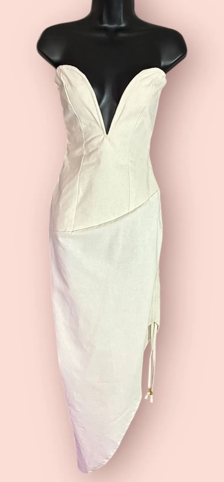 PLT Label White Plunge Ruched Midi Dress Strapless Party Cocktail US 0 Label Lab strapless white midi dress with a plunge V neckline and ruched bodycon fit. Woven fabric with drawstring detail—perfect for bridal events, bachelorette, graduation, vacation nights, or cocktail parties. Condition: New with tags (NWT). Size: 0 Color: White Features: strapless, plunge V-neck, ruched, midi length, woven, drawstring closure. Ships fast from a smoke-free, pet-friendly home. Thanks for visiting!