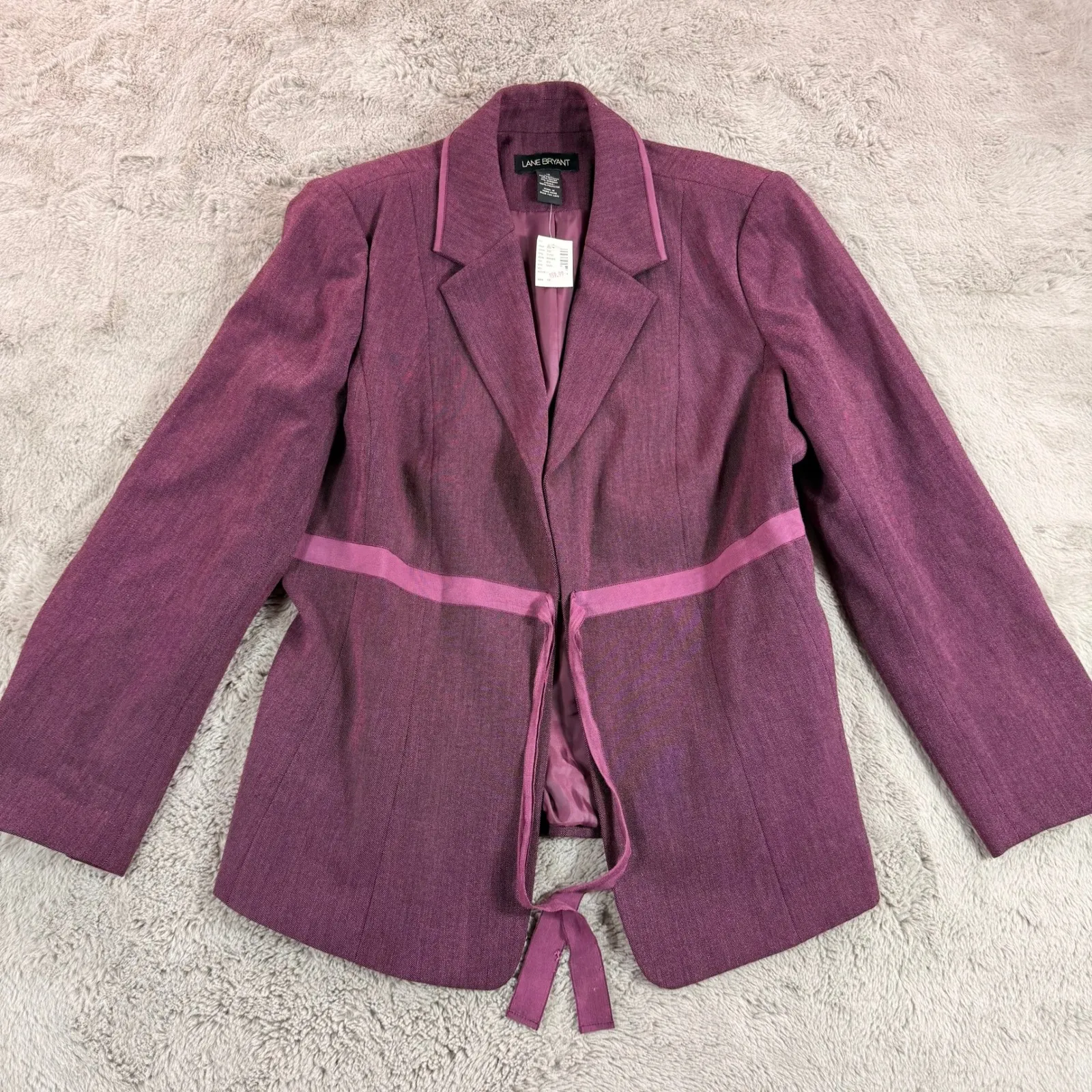 Keywords: Lane Bryant, Blazer, Jacket, Womens, Purple, Size 18, Career, Business, Office, Formal, Professional, Open Front, Tie Waist, Ribbon Accent